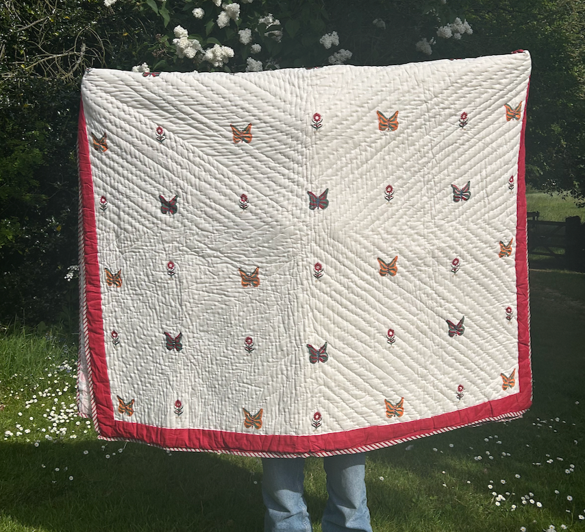 Butterflies and flowers on one side, an airy red design on the other.
